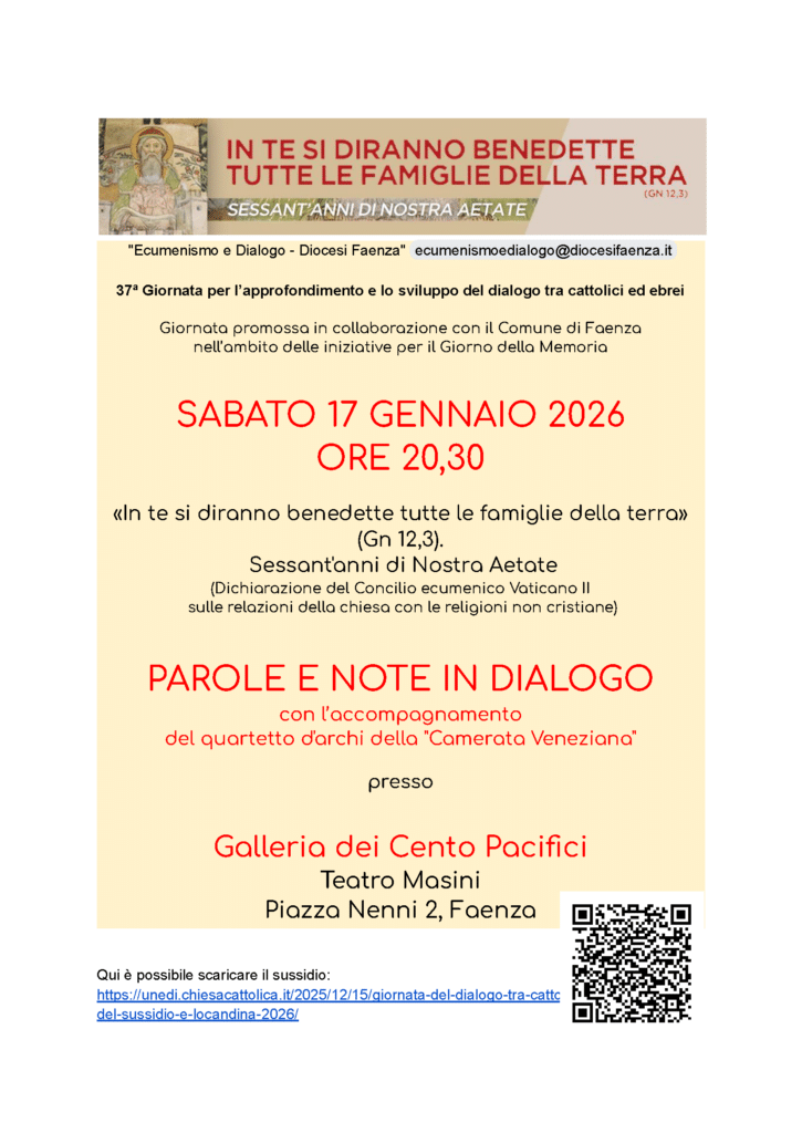 Qui è possibile scaricare il sussidio: https://unedi.chiesacattolica.it/2025/12/15/giornata-del-dialogo-tra-cattolici-ed-ebrei-fascicoli-del-sussidio-e-locandina-2026/