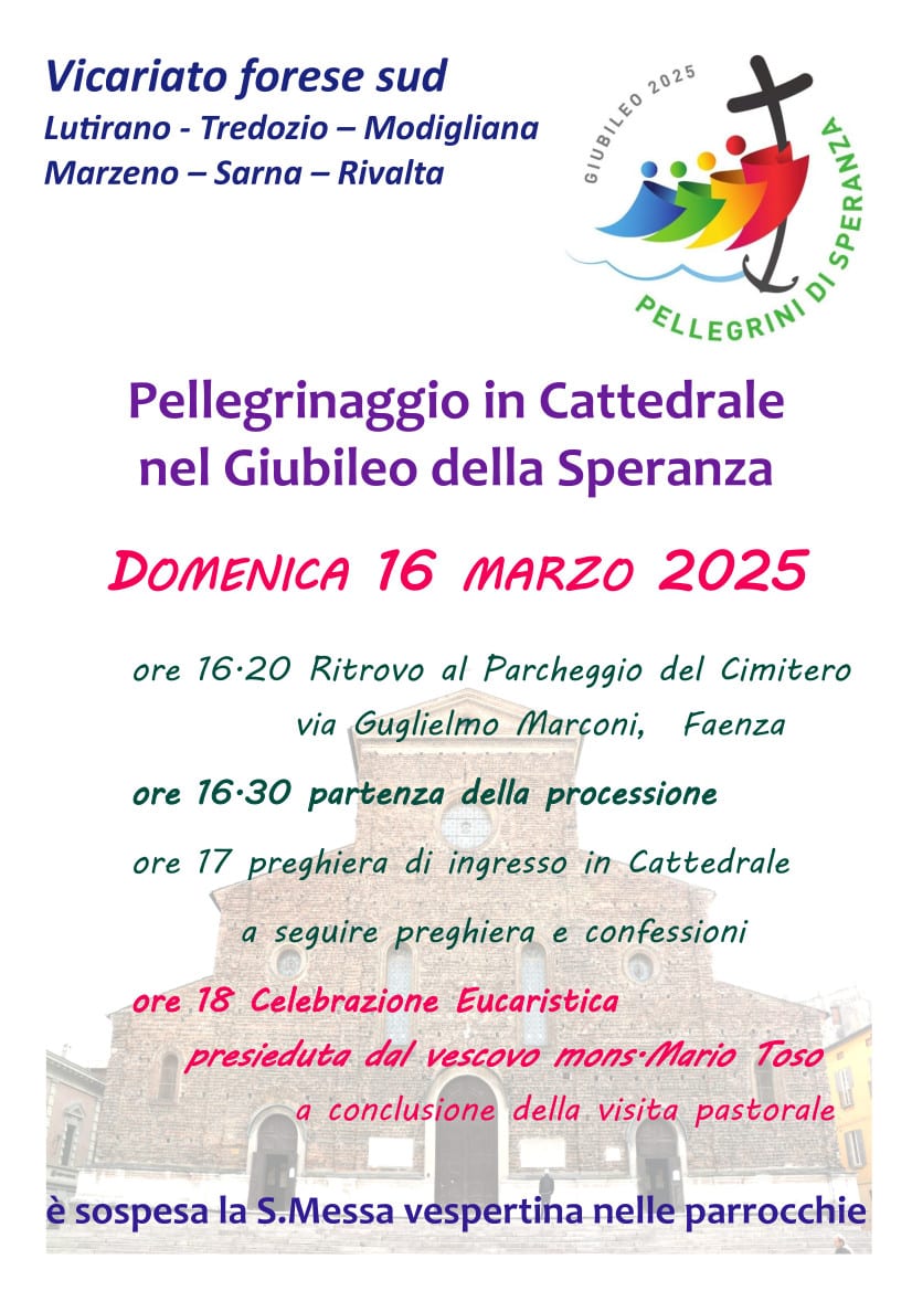 Domenica 16 marzo le parrocchie del Vicariato forese sud vivranno insieme il pellegrinaggio alla Cattedrale di Faenza. L’iniziativa coinvolgerà i fedeli di Lutirano, Tredozio, Modigliana, Marzeno, Sarna e Rivalta, che si riuniranno per un momento di preghiera e comunione spirituale.