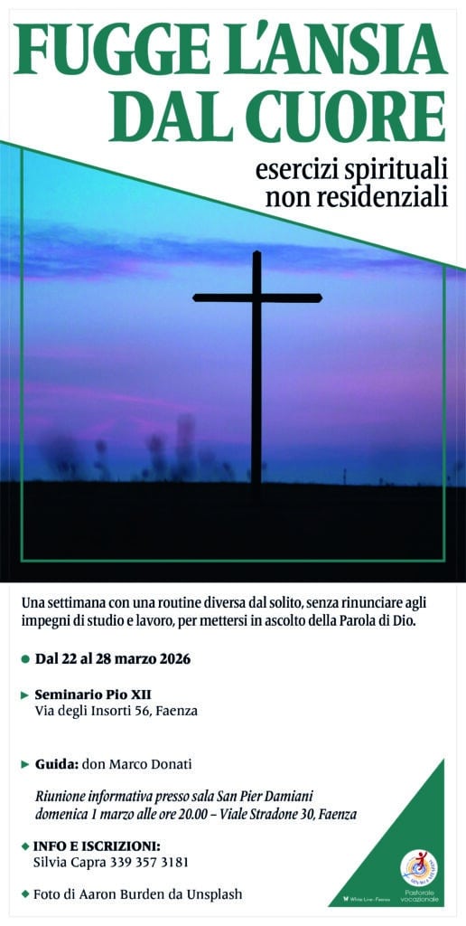 Dal 22 al 28 marzo 2026, presso il Seminario Pio XII (via degli Insorti 56, Faenza), si terrà una settimana di esercizi spirituali non residenziali dal titolo Fugge l’ansia dal cuore.