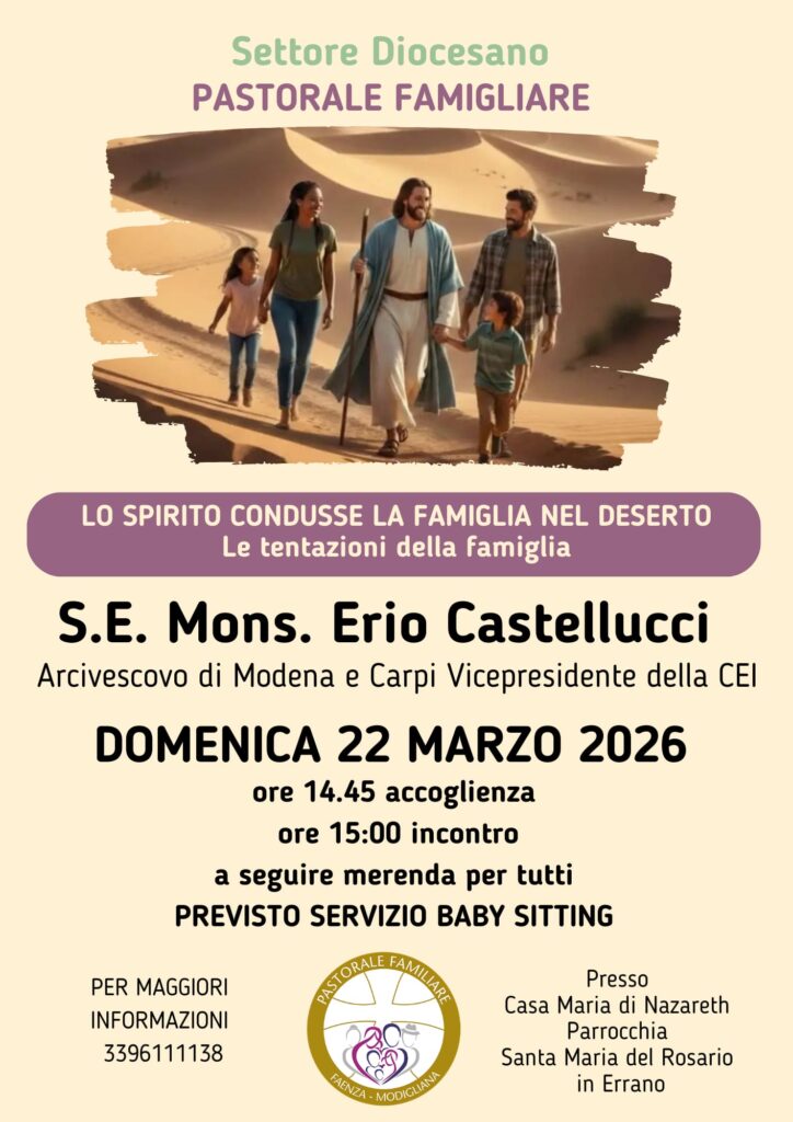 Nell’incontro promosso dal Settore Pastorale Familiare, domenica 22 marzo 2026, S.E. Mons. Erio Castellucci ha offerto una profonda riflessione sulle sfide che le famiglie moderne si trovano ad affrontare. Partendo dall’episodio evangelico delle tentazioni di Gesù nel deserto, il Vescovo Castellucci le ha declinate in “formato famiglia”, evidenziando come ciò che nasce come un dono possa talvolta trasformarsi in un ostacolo per la vita di relazione.