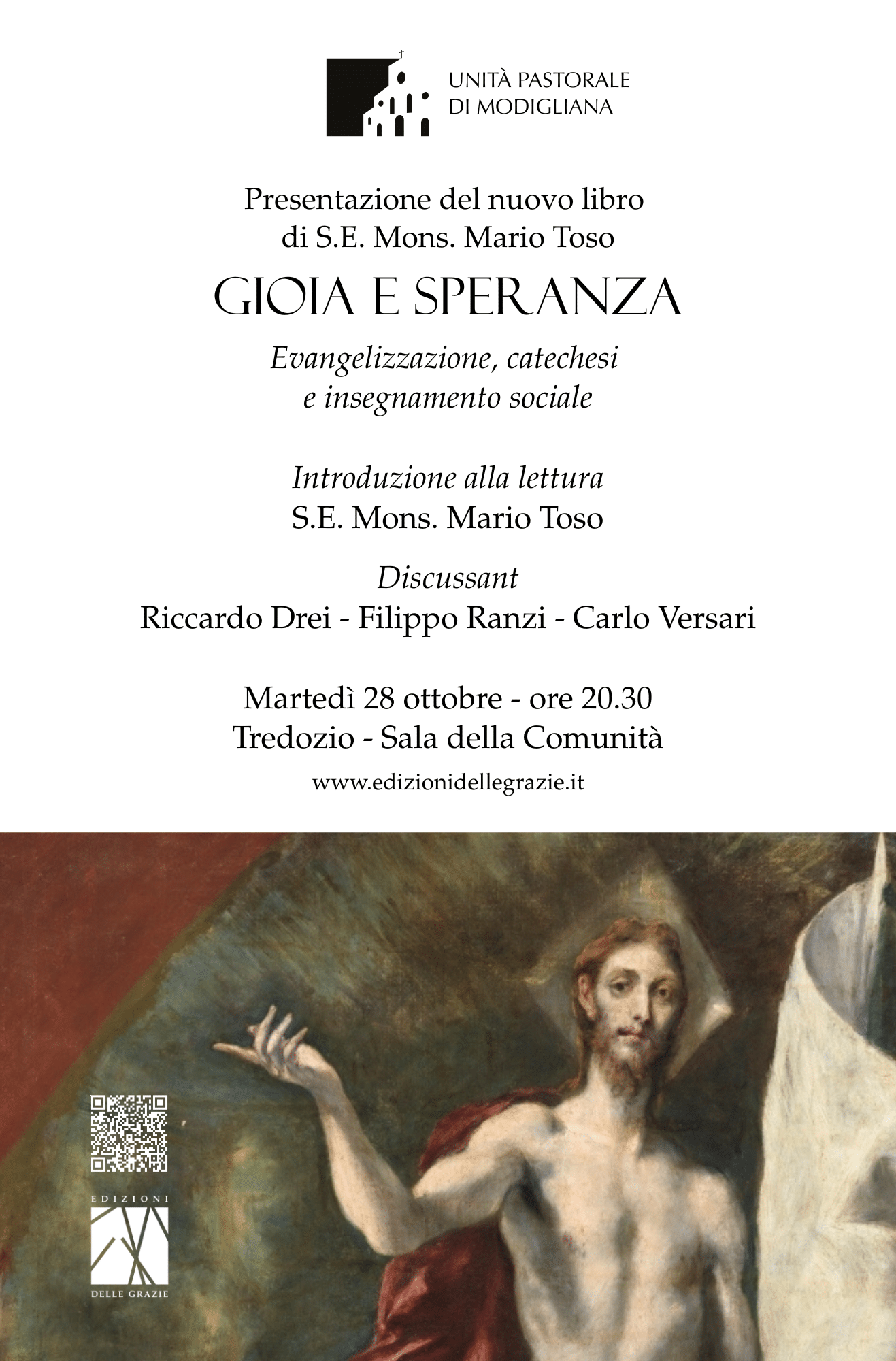 Martedì 28 ottobre, alle ore 20:30, presso la Sala della Comunità di Tredozio, si terrà la presentazione del nuovo libro di S.E. Mons. Mario Toso, intitolato “Gioia e Speranza. Evangelizzazione, catechesi e insegnamento sociale”.