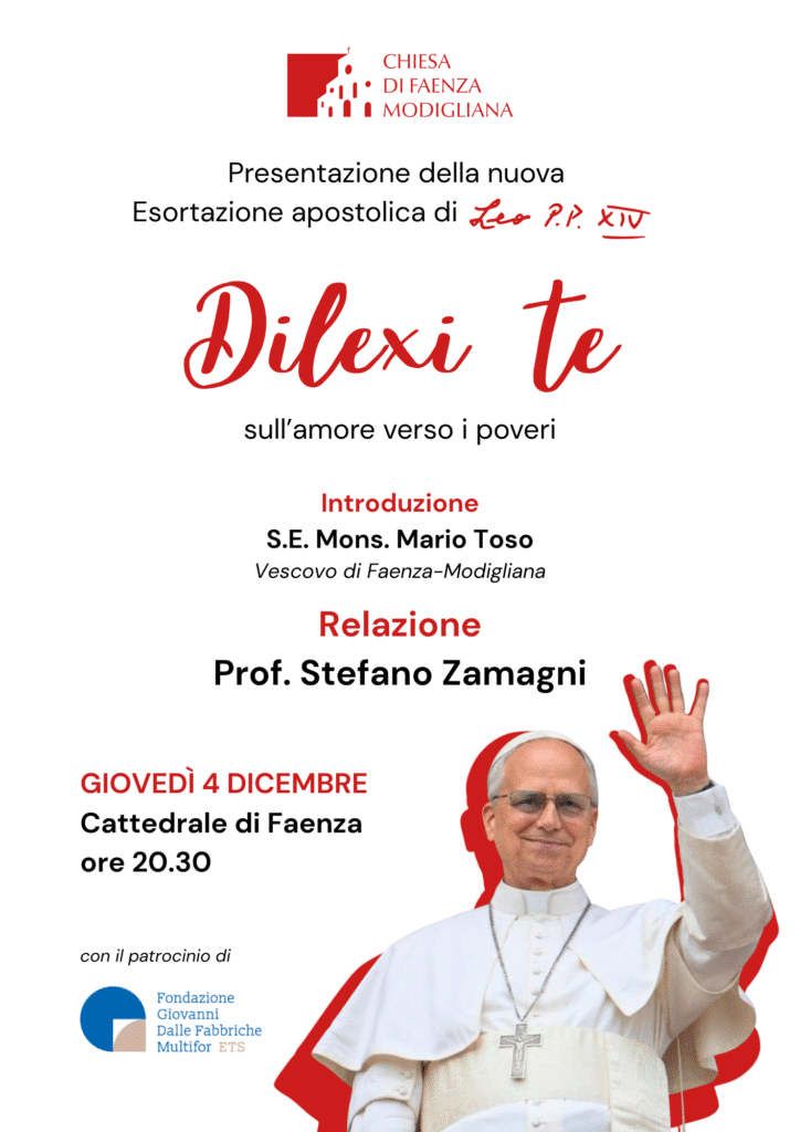 «Il cristiano non può considerare i poveri solo come un problema sociale: essi sono una “questione familiare”. Sono “dei nostri”. Il rapporto con loro non può essere ridotto a un ‘attività o a un ufficio della Chiesa» (Dilexi te, 104). Pertanto, per presentare adeguatamente questo importante documento del Magistero della Chiesa, desidero invitare ciascuno di voi e le realtà che rappresentate (Parrocchie, Settori pastorali, Associazioni e Movimenti ecclesiali) alla presentazione diocesana con il prof. Stefano Zamagni, giovedì 4 dicembre p.v. nella Cattedrale di Faenza, alle ore 20.30.